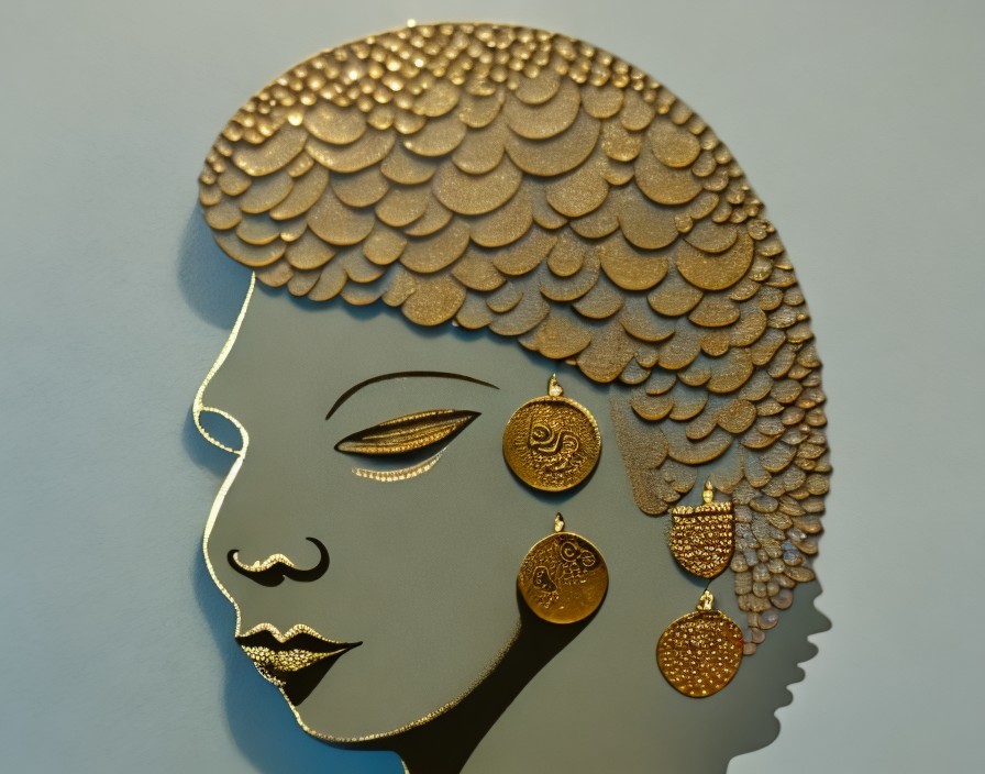 A golden 3D rendering of an elegant, stylized female profile with textured hair and decorative earrings.
