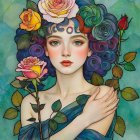 A young woman with curly, vibrant hair cradles colorful roses against a softly blended background. Her expressive eyes and delicate features convey a sense of grace and tranquility.