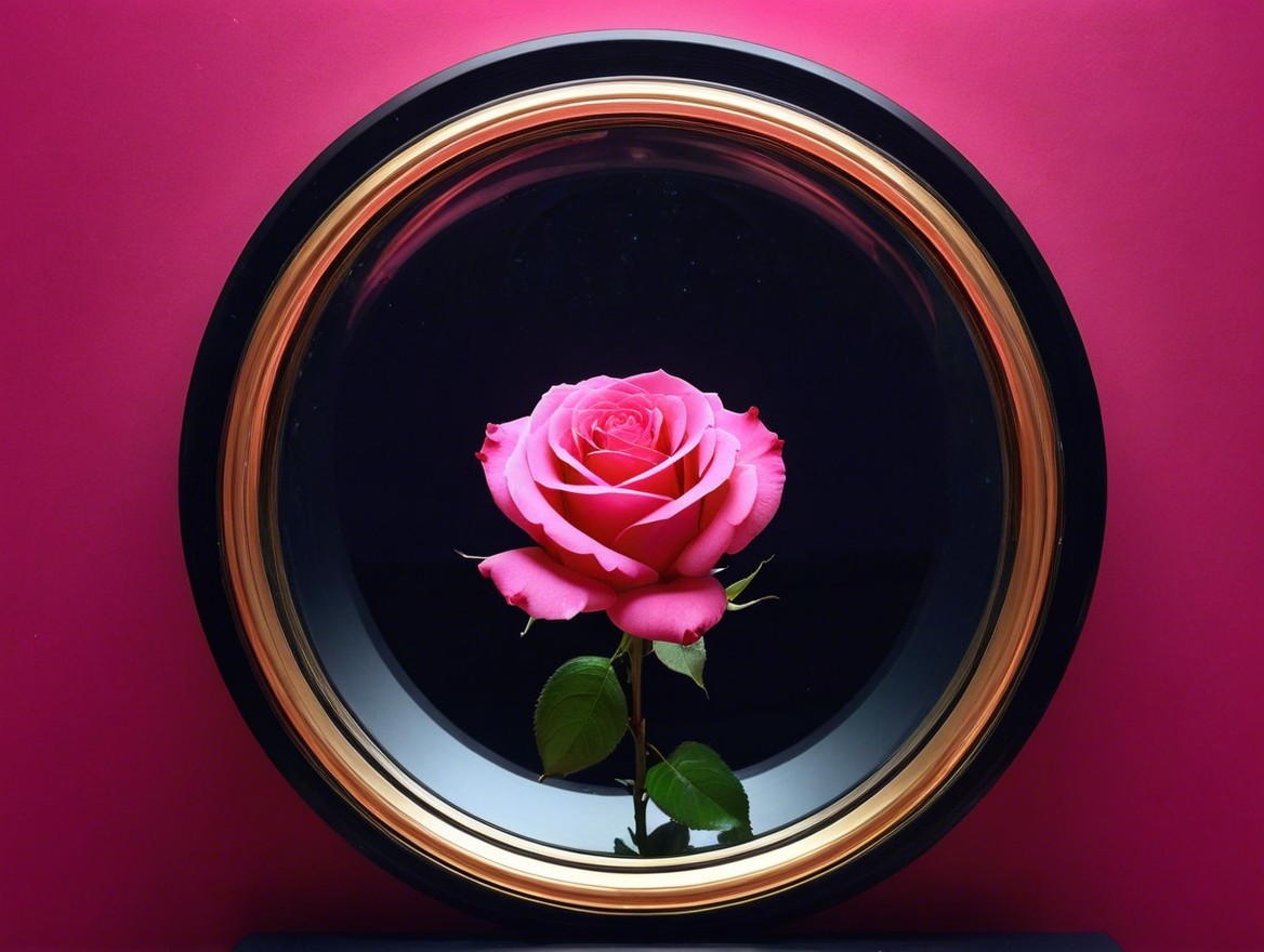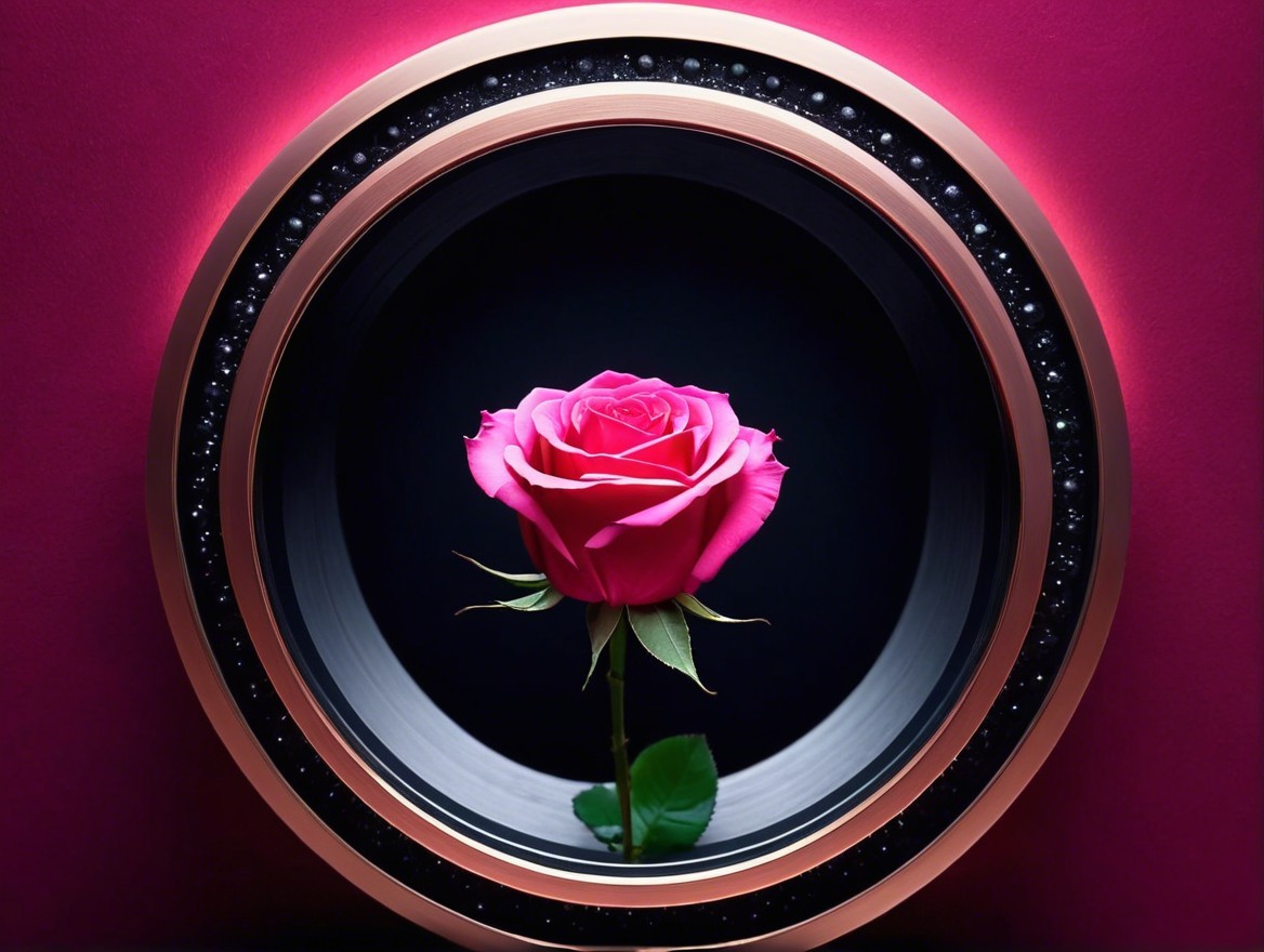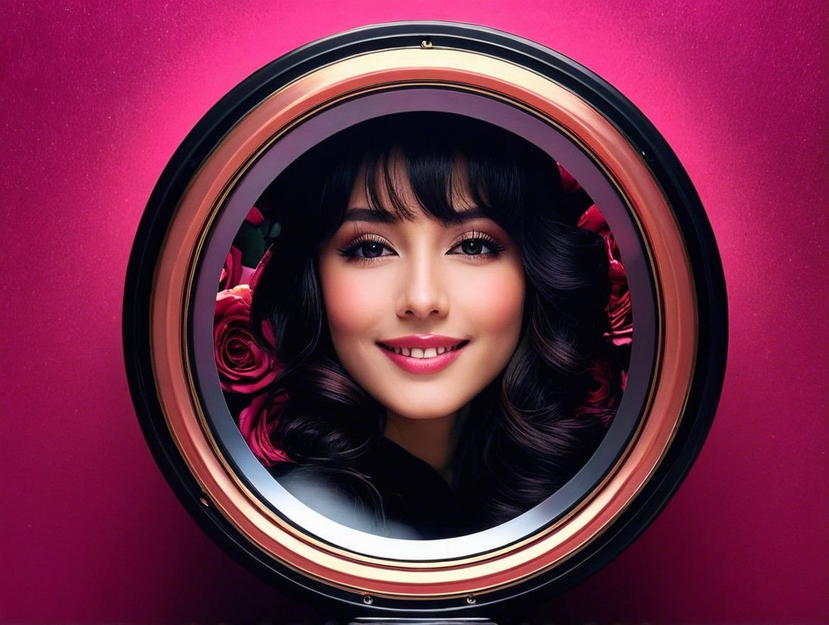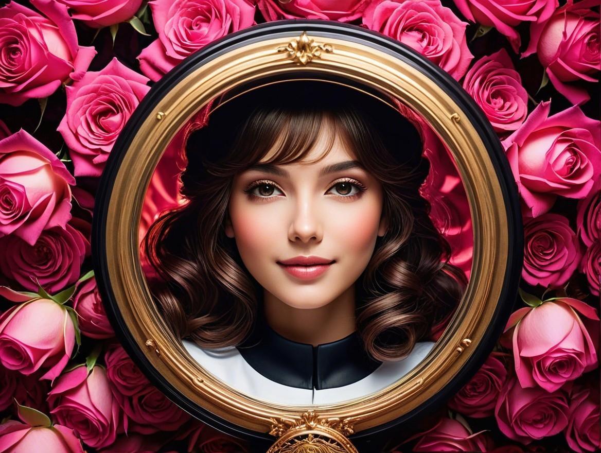 A beautiful woman with long, flowing hair adorned with elegant jewelry and floral accents, set against a vibrant backdrop of pink roses, exuding grace and charm.