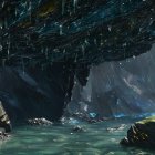 A serene fantasy scene featuring a mystical figure with flowing turquoise hair standing by a tranquil body of water, surrounded by lush trees and ethereal glowing elements.