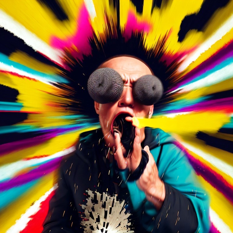 A person with wild hair, sunglasses, and a microphone performs intensely against a vibrant, explosive background.