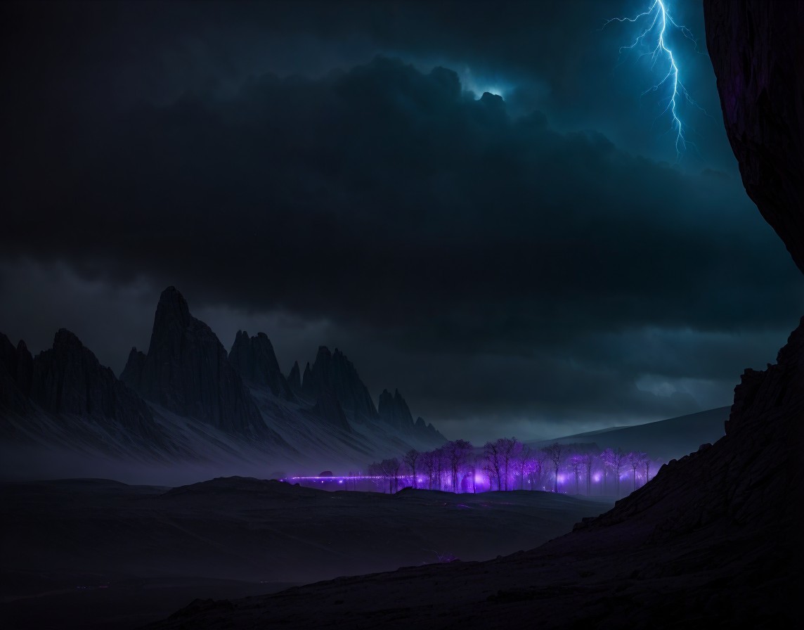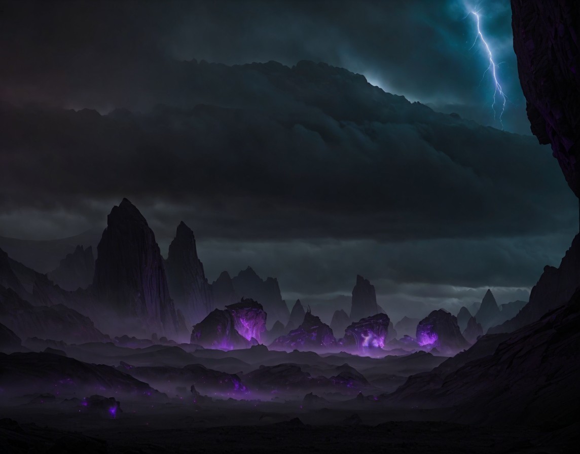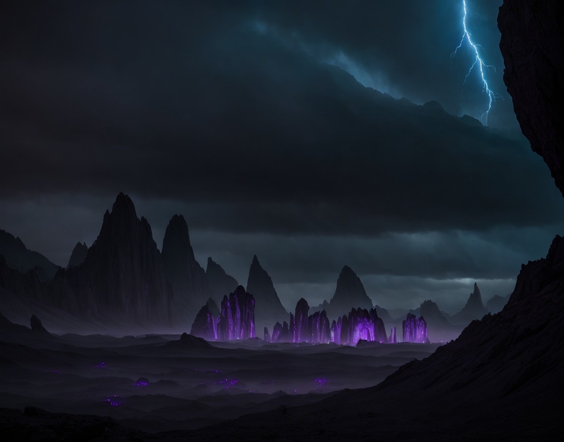 A dramatic night landscape with stormy clouds, lightning, and jagged mountains under a foreboding sky with eerie purple lights.