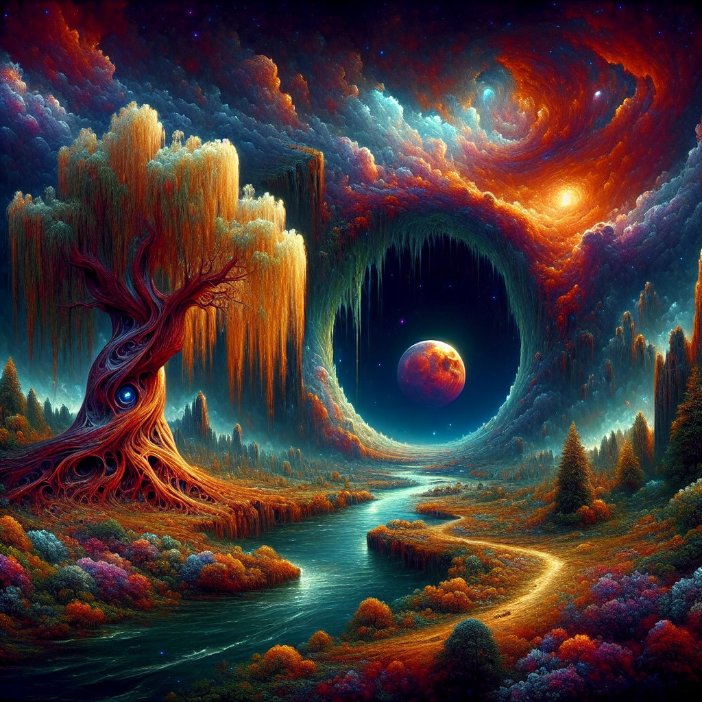 A vibrant landscape features a majestic tree surrounded by colorful foliage, flowing water, and a cosmic backdrop of swirling galaxies and a glowing planet, creating a dreamlike atmosphere.