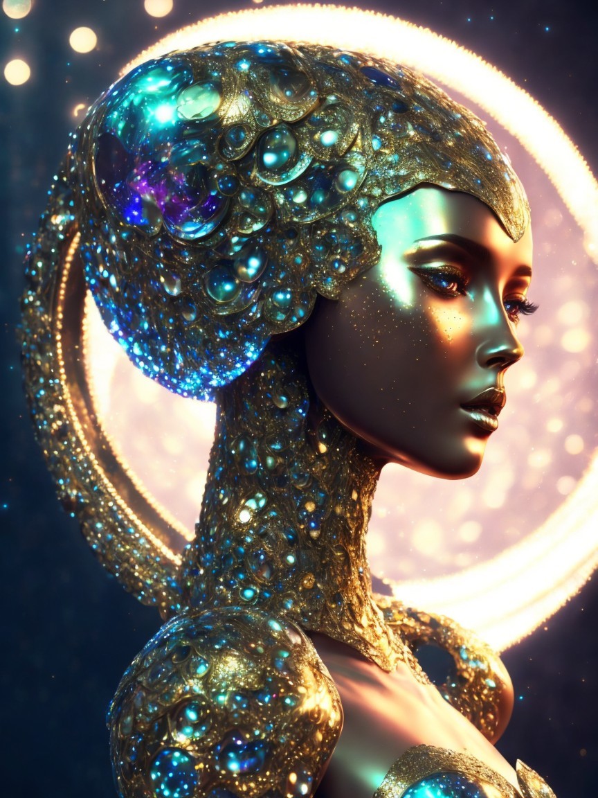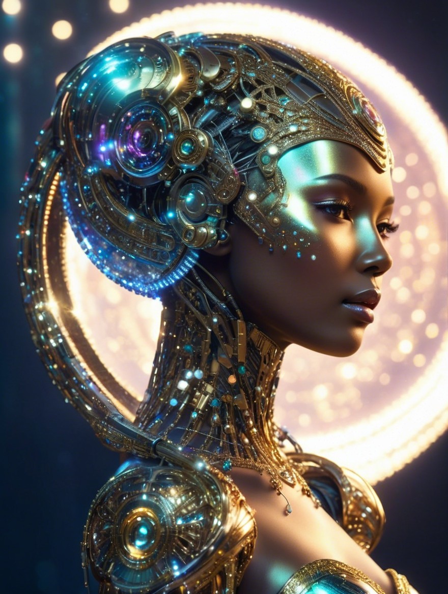 A futuristic, elegant humanoid robot features intricate golden circuitry, glowing accents, and a sophisticated design. Its profile radiates a blend of technology and artistry against a glowing backdrop.