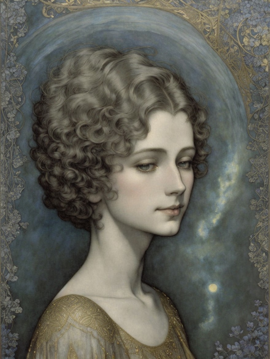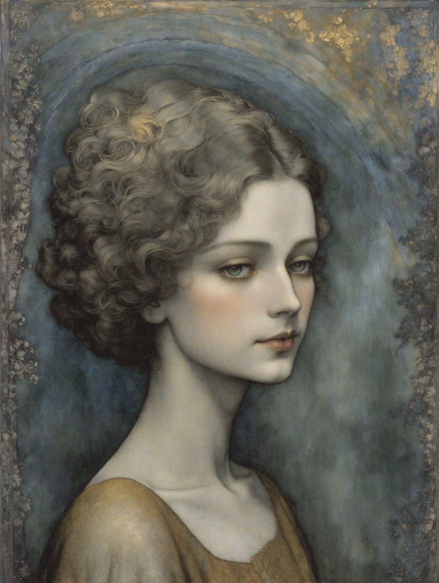 A delicate portrait of a young woman with curly hair, adorned with a decorative headband. Her soft expression and elegant attire are framed by a blue and gold background, evoking a classic aesthetic.
