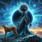 A mystical figure in a flowing blue gown stands on a mountaintop, surrounded by swirling cosmic colors. A leopard accompanies her, set against a vibrant, otherworldly backdrop.