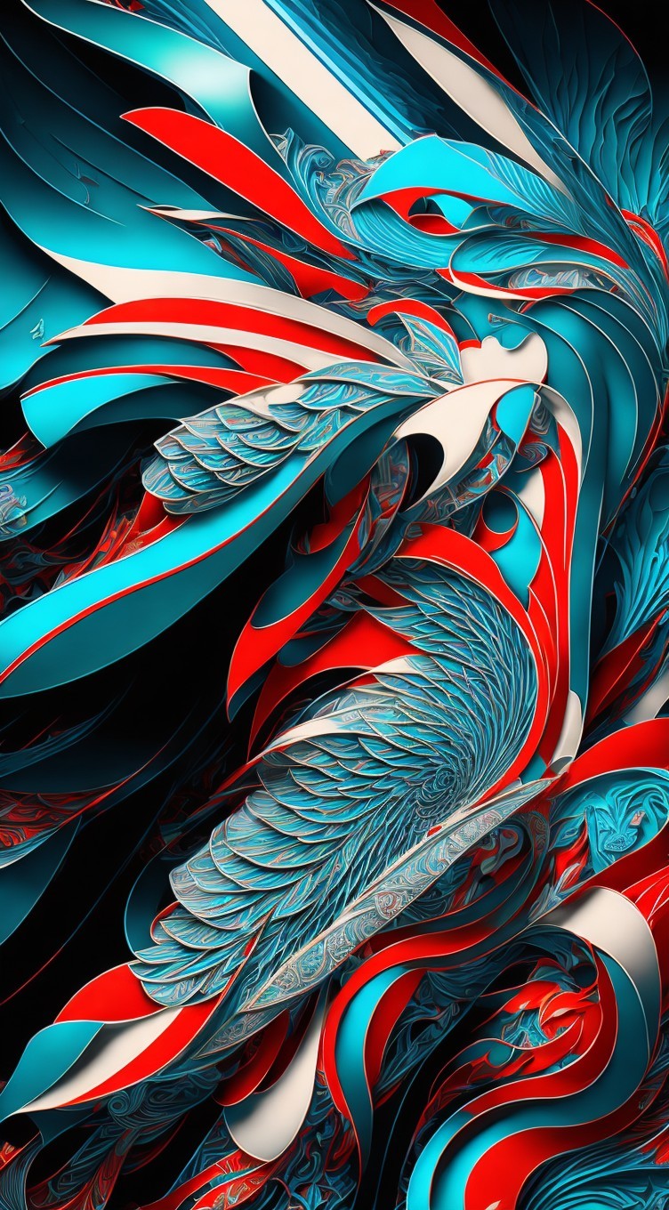 A striking superheroine with vibrant blue hair and a silver-red armored outfit, featuring dynamic wings and a bold stance, exudes confidence and strength against a stylized background.