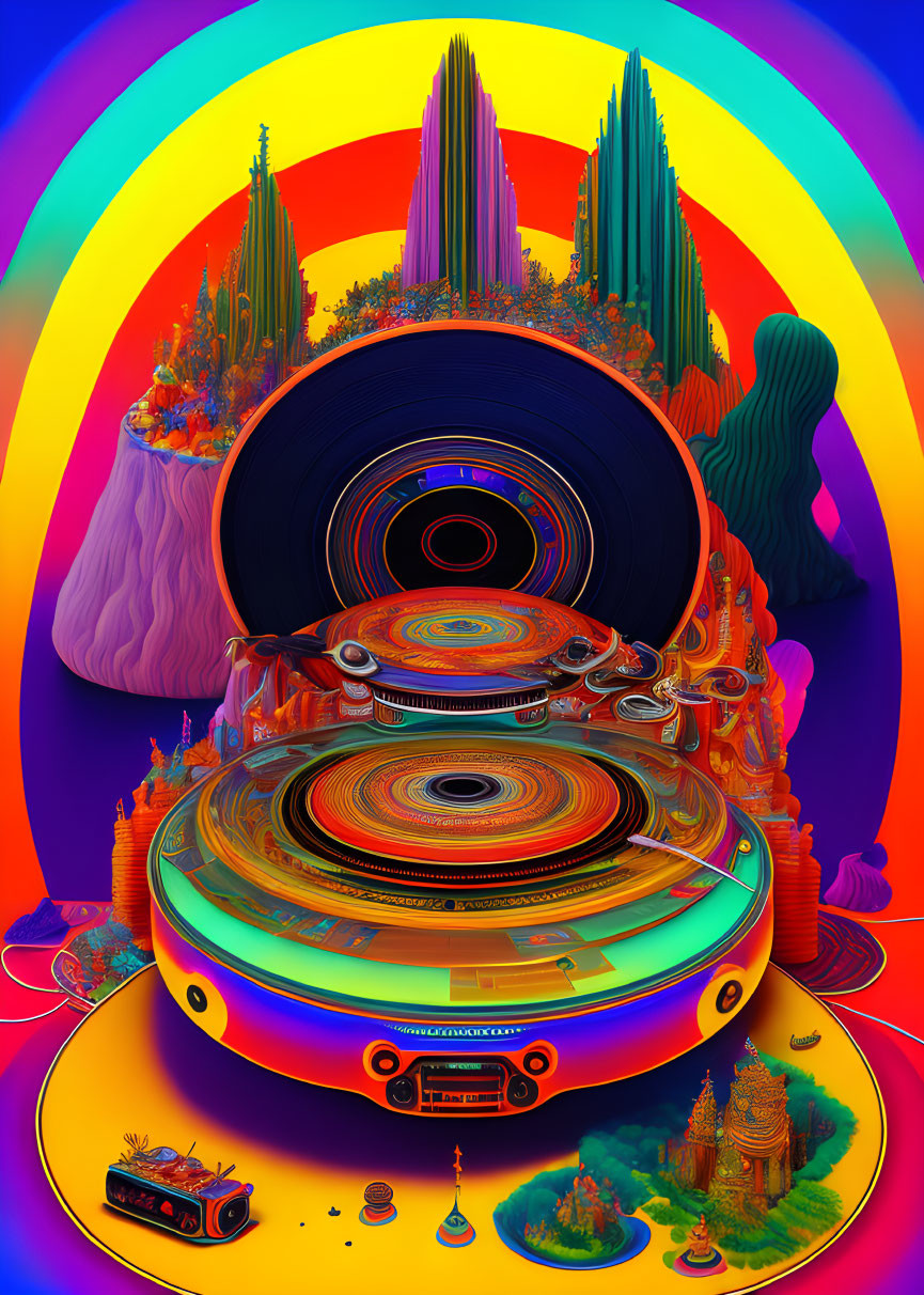 Prompt: Music symbolism bursting from an open turntable, by Terry Gilliam, poster illustration, no text, ultra detailed, awesome, surreal, music festival vibe, colorful vintage feel, wonky, a masterpiece, ultra colorful, ultra bizarre, crammed packed