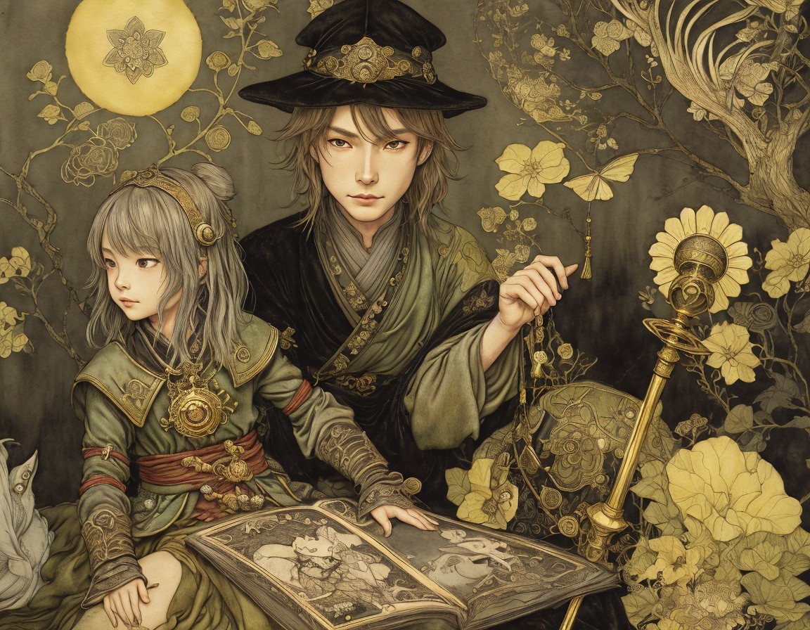 A whimsical scene featuring a wise frog in a dark robe, standing by a serene pond with water lilies. Another frog rests nearby, surrounded by lush greenery and a glowing moon.