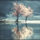 Years passed. The villagers forgot their names. But the trees kept blooming, soft gold at first light, their branches leaning toward each other like unfinished prayers. On calm mornings, their reflections meet perfectly on the water, as if the lake itself remembers the faces that once waited there.