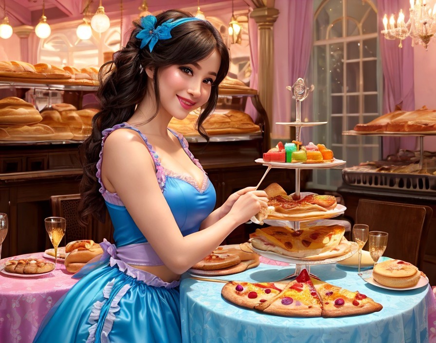 A woman in a blue dress is smiling while arranging pastries in a bakery with colorful treats displayed around her.