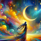A vibrant, swirling scene of colorful cosmic elements fills the background, featuring a crescent moon. A silhouette of a woman stands, her flowing dress blending with the vivid hues surrounding her.