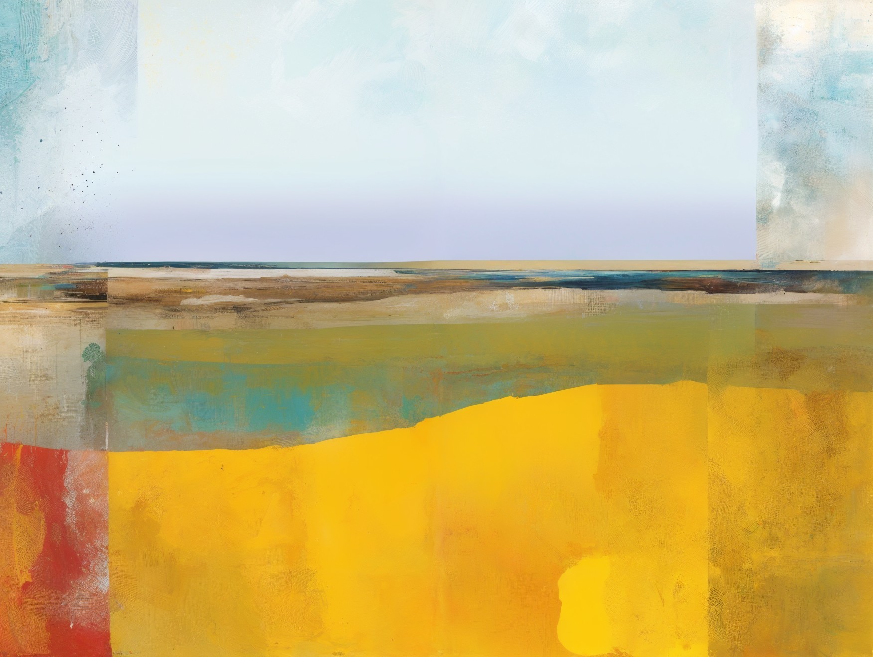 The artwork features two figures standing on a beach, facing a vast, abstract landscape. The scene blends calm blue skies with vibrant yellow sands, evoking a sense of solitude and contemplation.