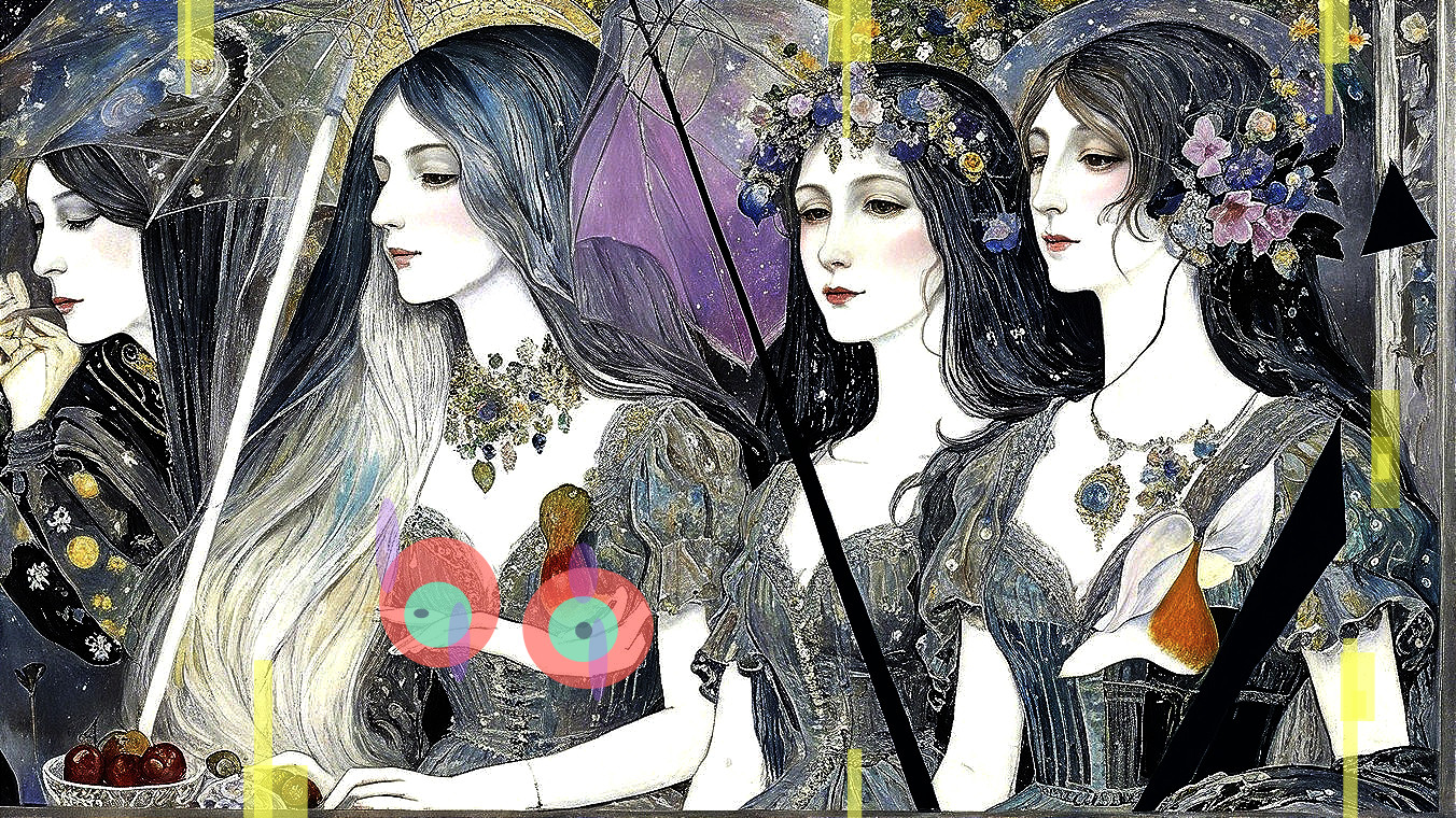 Four elegant figures stand side by side, each adorned in intricate dresses. They hold umbrellas and feature unique hairstyles, with delicate accessories highlighting their ethereal beauty and grace.