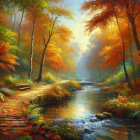 A serene autumn landscape features a gentle stream winding through vibrant orange and gold foliage. A quaint bridge and a lamp post enhance the tranquil scene, with pumpkins dotting the shore. thanks to Crystaldelic
