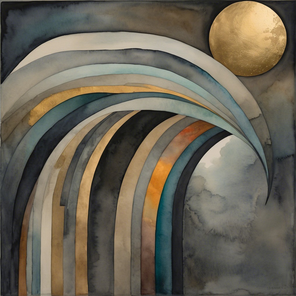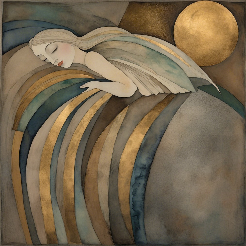 The artwork features a serene woman with striking makeup, adorned with large golden feather earrings, set against a dark background with a glowing golden moon, conveying a sense of tranquility.