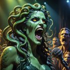Medusa, a striking figure with green skin and long, dark hair entwined with snakes passionately sings into a microphone, surrounded by fascinated onlookers who have turned to stone. The atmosphere is dramatic and intense.