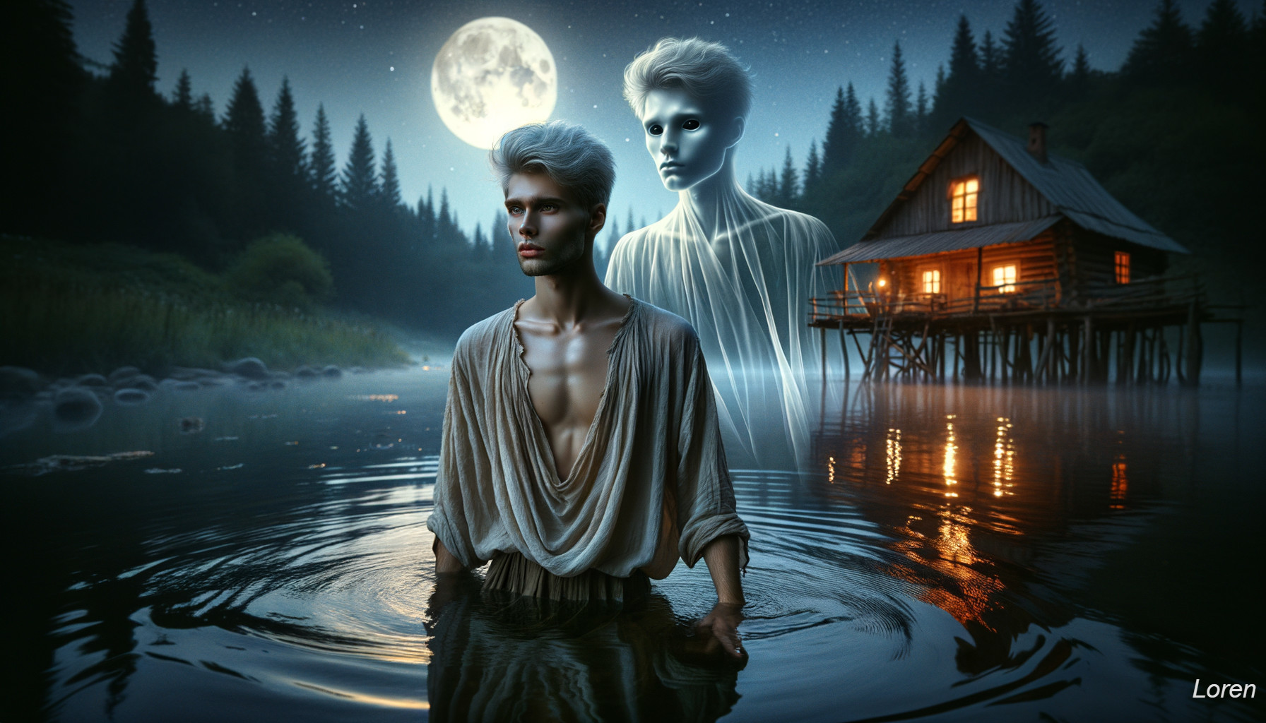 A person and a ghostly figure stand in water near a cabin under a moonlit sky.