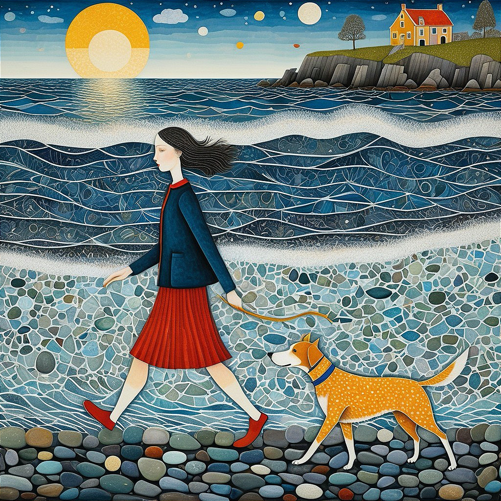 A whimsical, stylized illustration depicts a woman and a dog walking along a pebbly beach with waves crashing against the shore under a sky with a large sun and moon. The woman is on the left, shown in profile, walking towards the right. She has dark hair flowing slightly behind her, a light