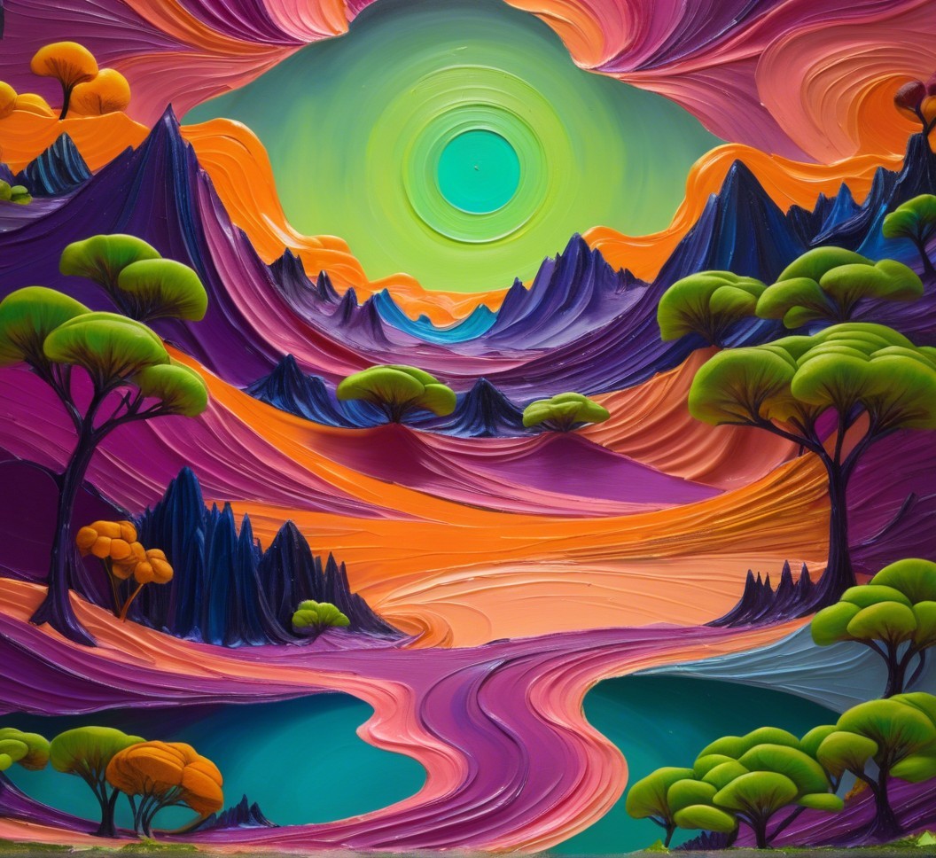 A vibrant landscape painted in thick strokes, featuring purple mountains, lush trees, and a winding river. The sky glows with a bright sun, radiating warm orange and green hues, creating a serene atmosphere.