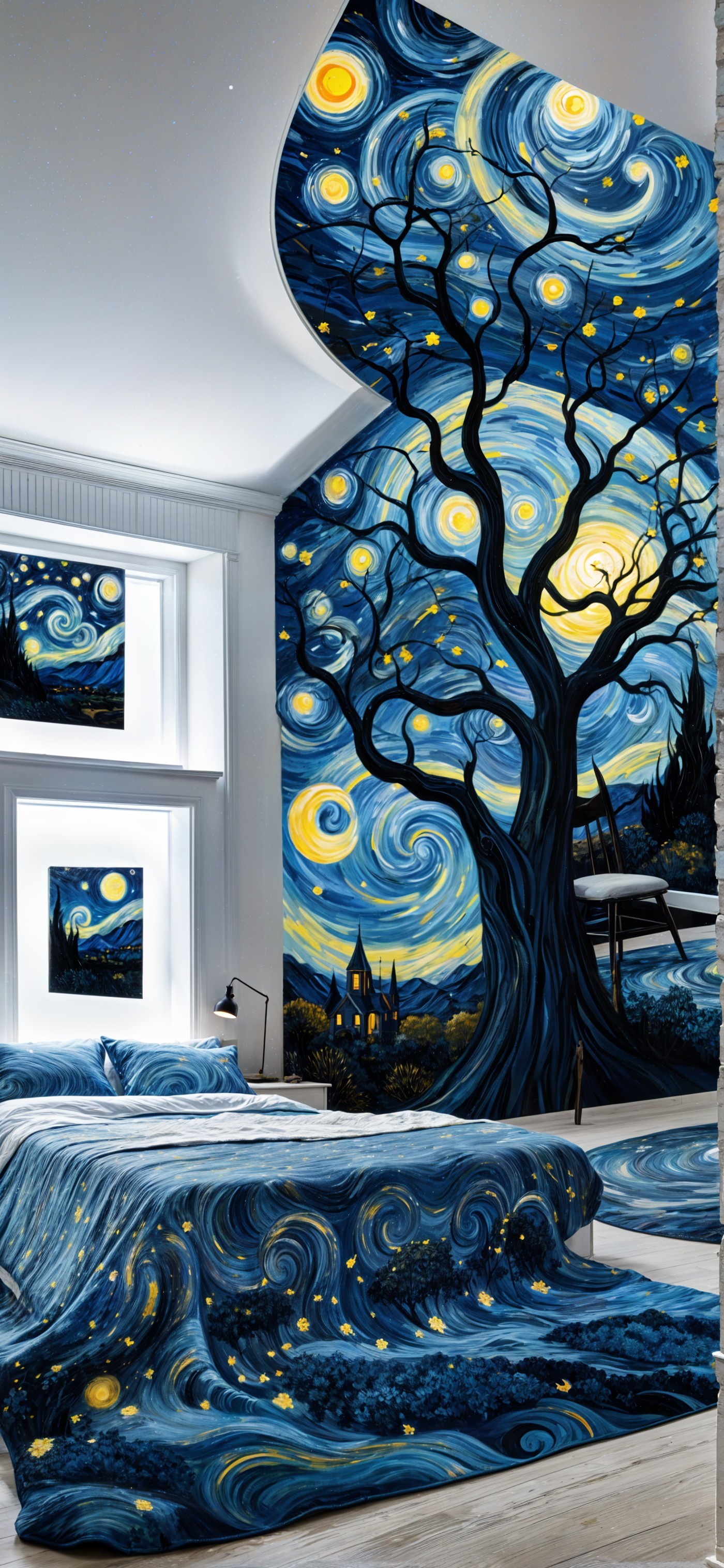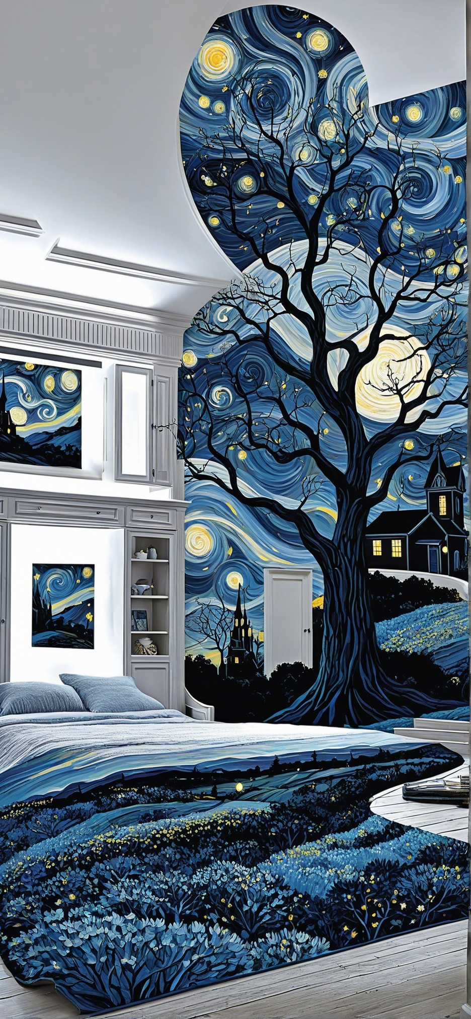 A stunning bedroom design featuring a tree mural inspired by Van Gogh's style, with swirling night skies, glowing stars, and cozy houses, creating a dreamy, artistic atmosphere.