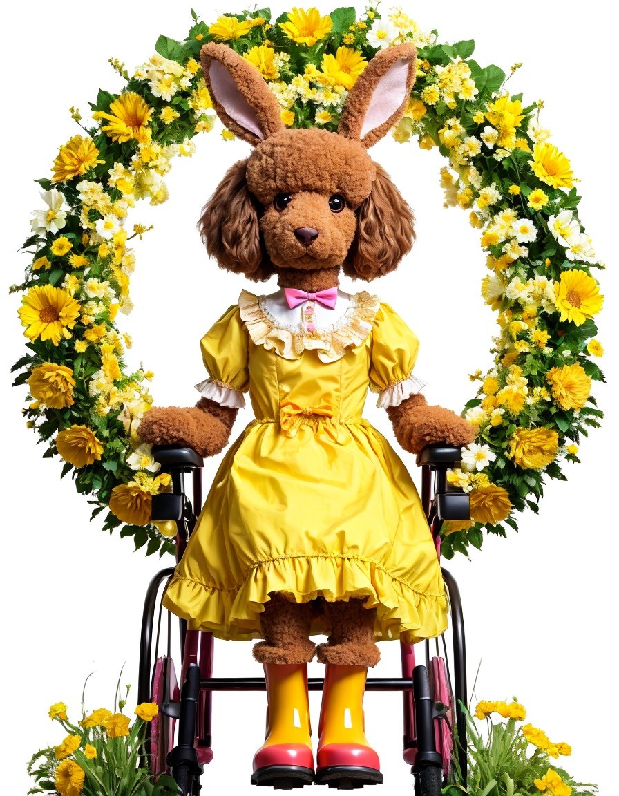 Prompt: Anthropomorphic, humanoid: easter bunny big brown humanoid Poodle, wearing a yellow gardener's dress, yellow gardener's clothes, orange rubber boots on feet, wheel chair, wearing gloves, yellow sun flowers, red flowers, pink flower, plants, (anthropomorphic), humanlike, anthropoid, anthropomorph, chimera, full body, head to toe, (no human face)