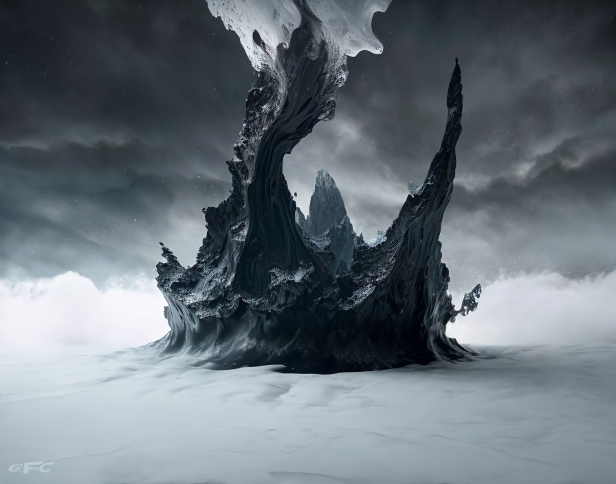 A surreal image of a black liquid structure with blue highlights, resembling a splash, against a stormy sky above a cloudy expanse.