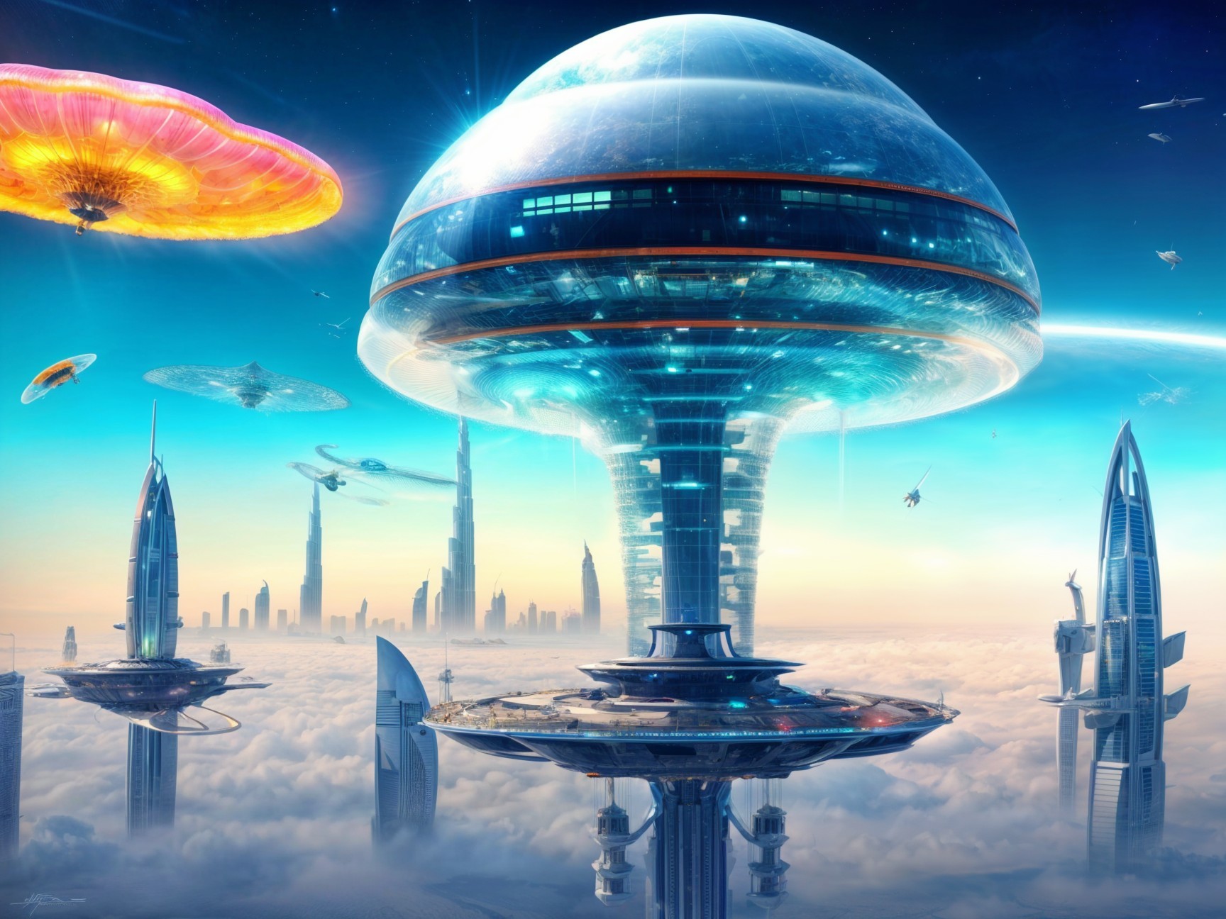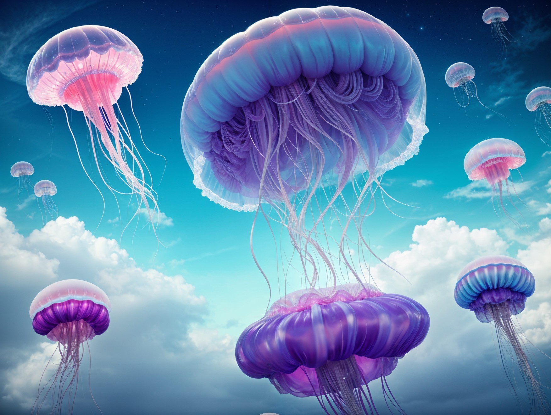 A surreal scene featuring floating jellyfish in vibrant shades of pink and purple against a dreamy blue sky, surrounded by soft, fluffy clouds. An imaginative and whimsical underwater world.