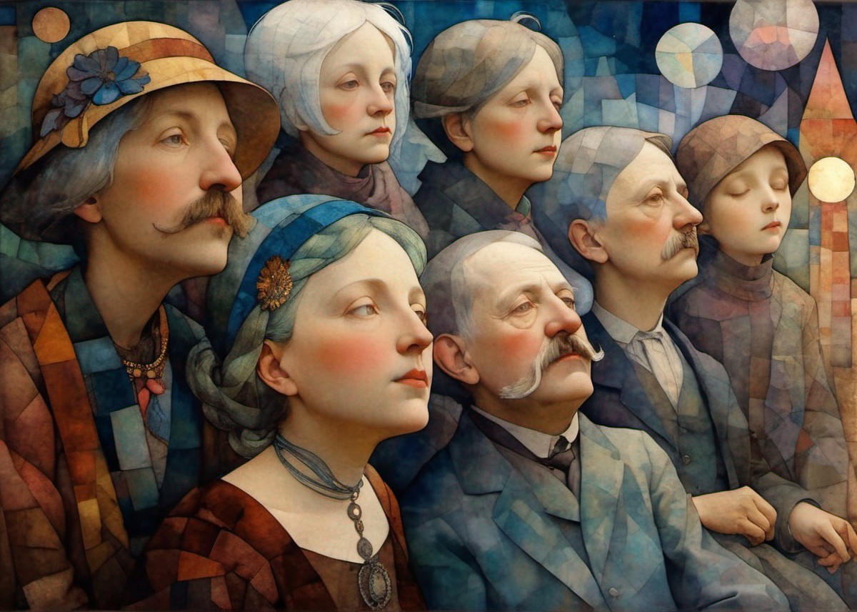 Patchwork pandemonium, portrait in plutonium, patina of ancient stone with moss, art brut, moody, somber, desaturated colors, in the style of Paul Klee, Banksy, Arthur Rackham,