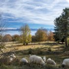 A woman sits on a stone in a lush green field, surrounded by grazing sheep. Majestic mountains rise in the background under a partly cloudy sky, creating a serene rural scene.