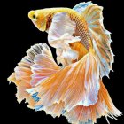 A vividly colored betta fish with flowing, elaborate fins, resembling delicate silk. The intricate patterns and soft hues create a stunning, artistic representation against a dark background.