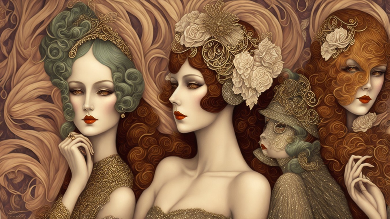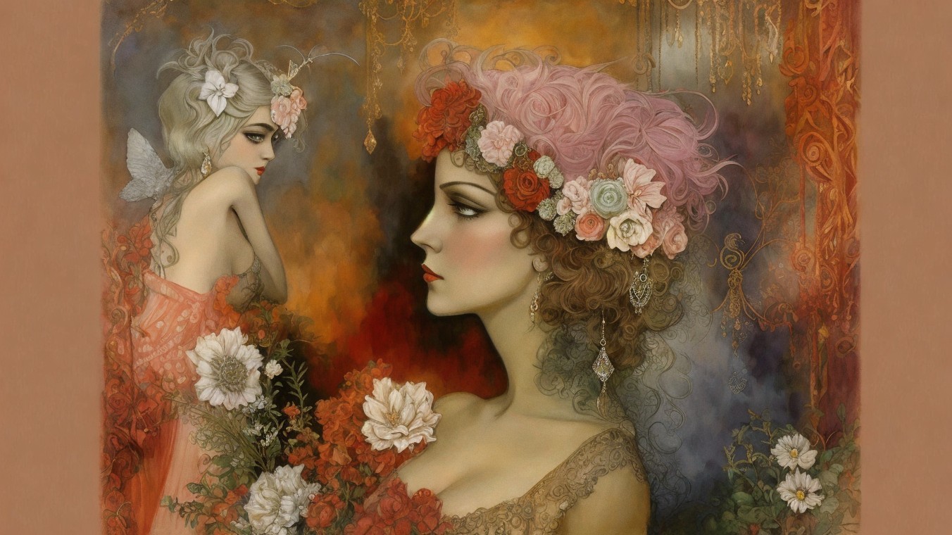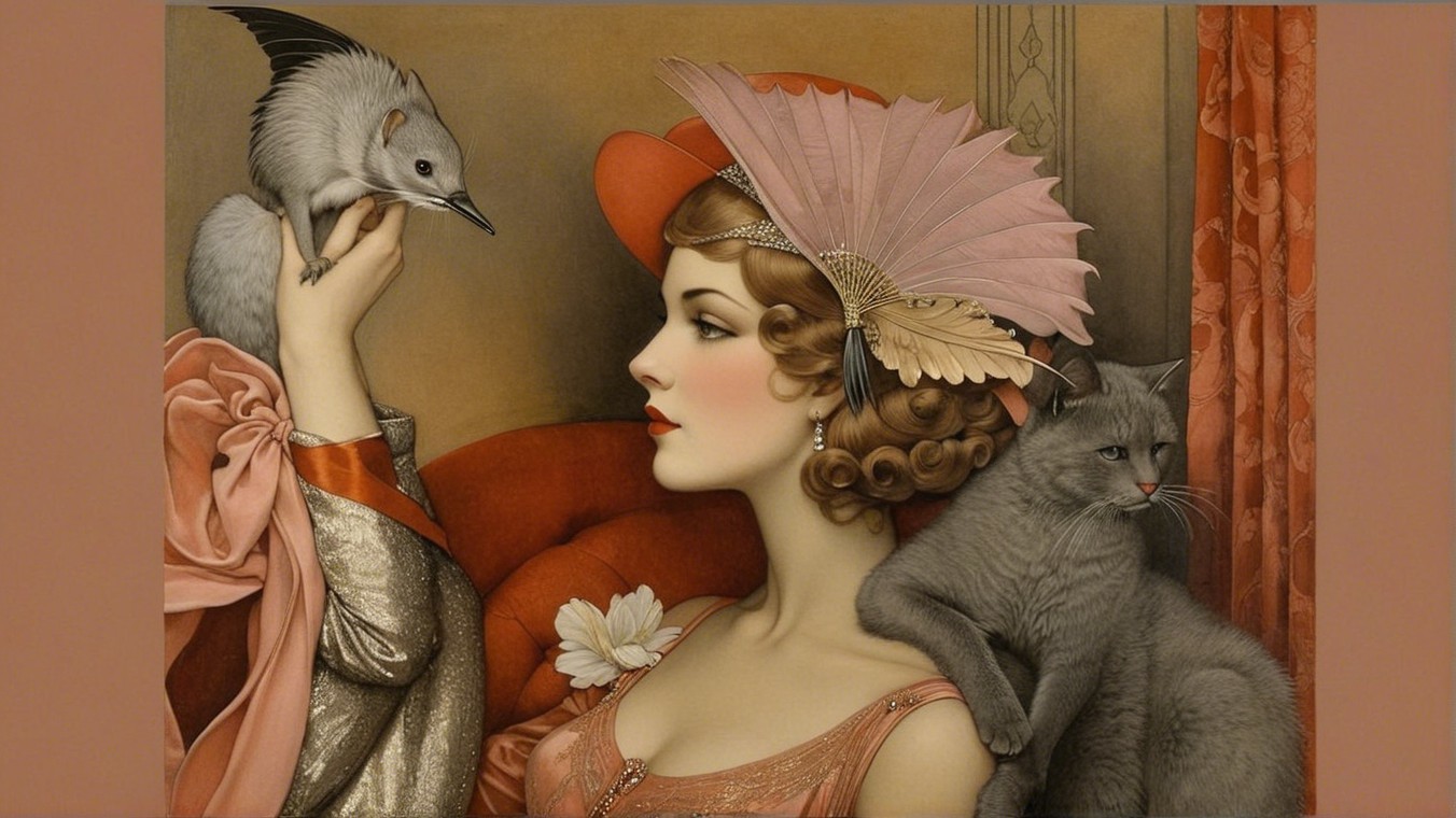 A stylized woman with sleek, dark hair gazes serenely at a small white bird, while a large, elegant bird rests on her shoulder, creating a striking contrast in a muted, artistic setting.