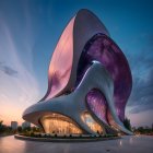 A futuristic building with a fluid, organic design featuring vibrant purple accents and large glass windows. It's set against a colorful sunset, surrounded by modern skyscrapers and greenery.