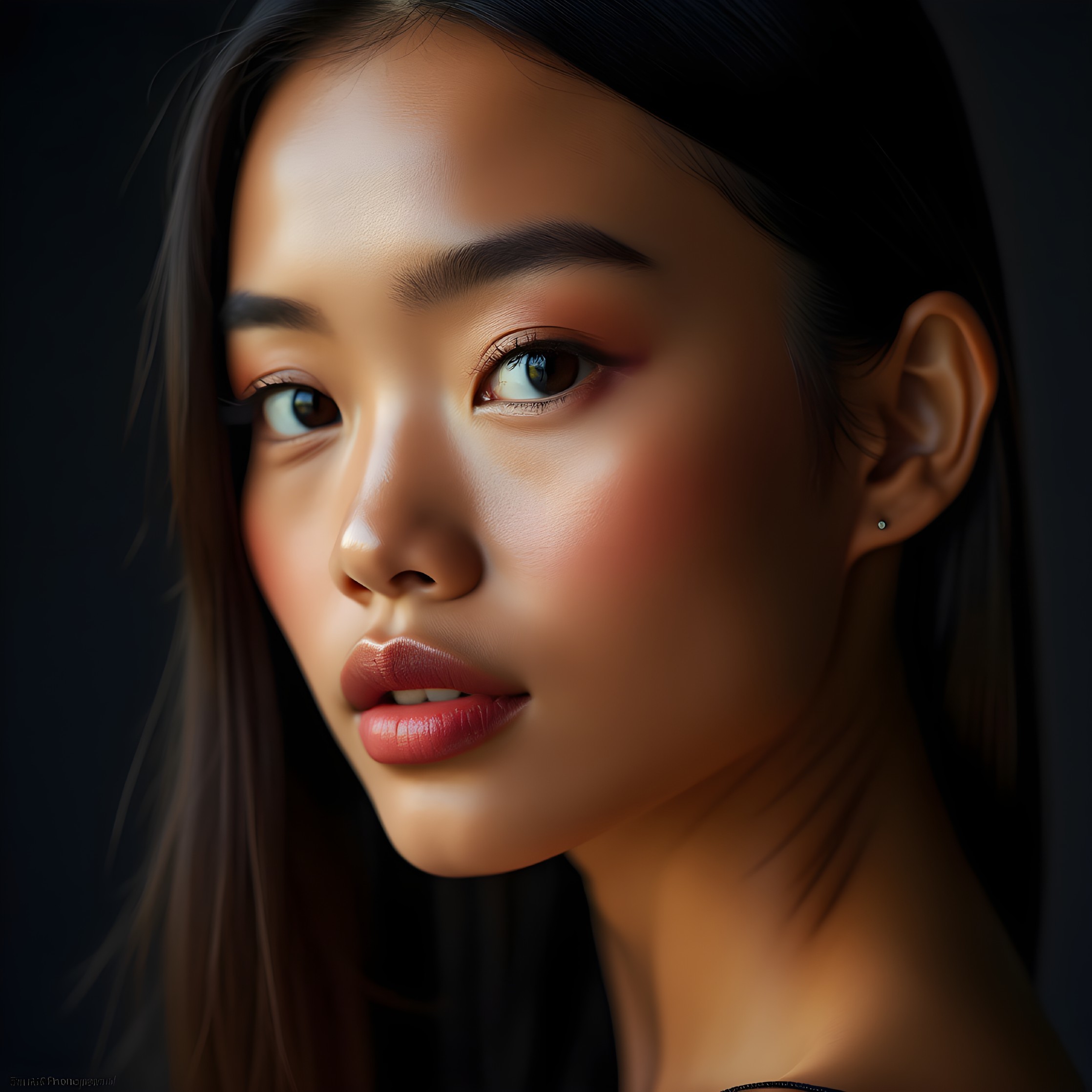 A close-up portrait of a young woman with long dark hair, striking features, and a soft expression. The lighting highlights her radiant skin and captivating eyes, creating a mesmerizing effect.
