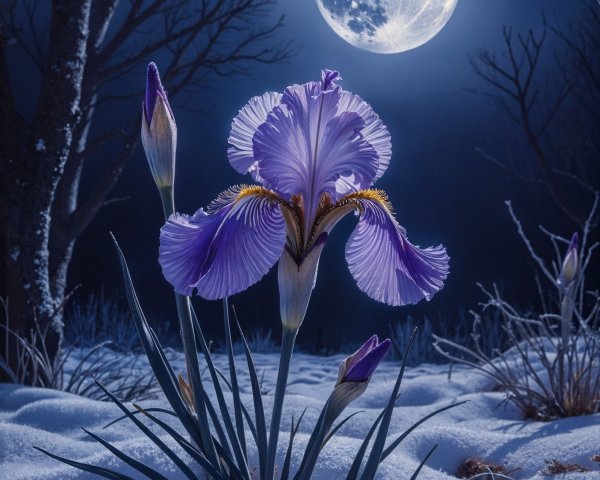A vibrant purple orchid blooms from a cracked stone, surrounded by glowing mushrooms and soft mist, creating an enchanting, mystical atmosphere with a touch of nature's beauty.