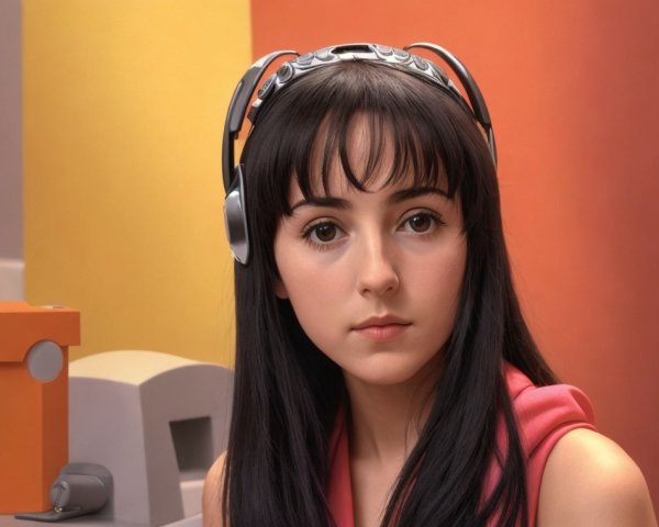A striking figure in a vibrant red helmet adorned with a clock and colorful flags. The person features a prominent mustache and a confident expression, showcasing a unique and bold style.