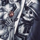 A glamorous woman with red hair and dark makeup poses with a skeleton in a top hat. Both hold playing cards, adding a touch of mystery and allure to their striking, edgy look.