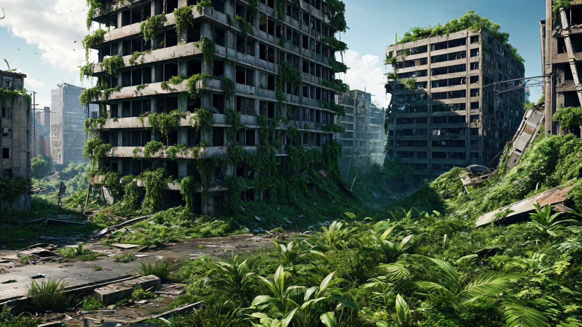 A lone figure stands amidst overgrown ruins of towering, abandoned buildings, nature reclaiming the landscape under a bright blue sky, hinting at both beauty and desolation in a post-apocalyptic world.