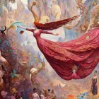 The image features an intricate, vibrant scene filled with elegantly dressed figures. A central woman in a flowing red gown and ornate patterns gracefully extends her arm, surrounded by whimsical elements.