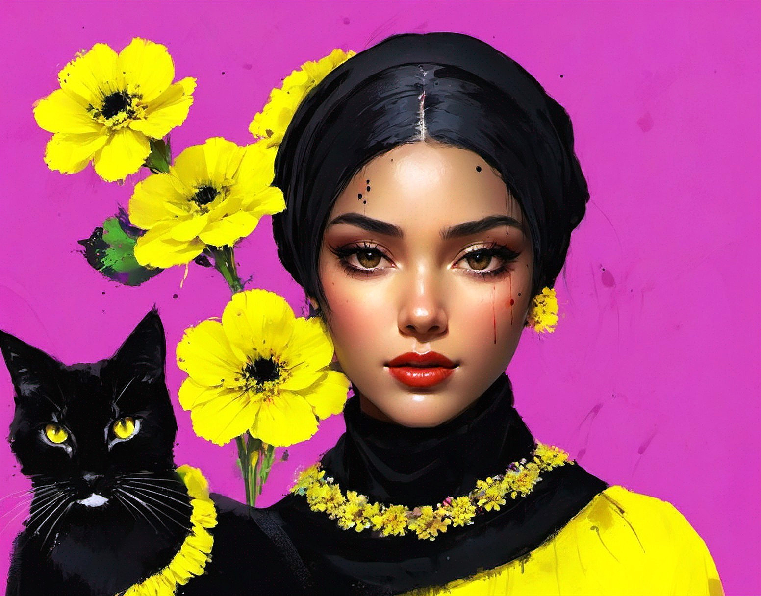 A stylized painting of a woman with a black headscarf and yellow flowers next to a black cat against a pink background.