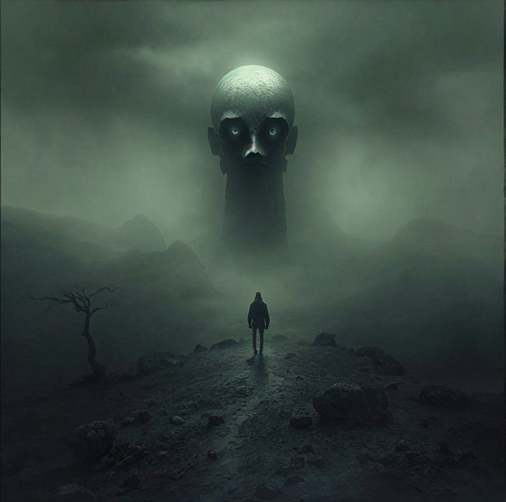 A lone figure stands on a desolate road, shrouded in fog. Towering above is a massive, ominous head with glowing eyes, creating an eerie and surreal atmosphere. The landscape is stark and haunting.