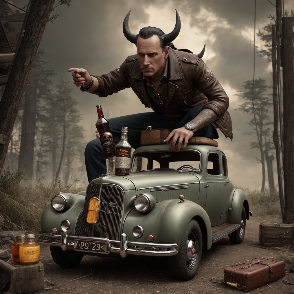 A stylized image of a devilish figure with horns and a tail sitting on an old-fashioned car, pointing, with a bottle on the car hood.