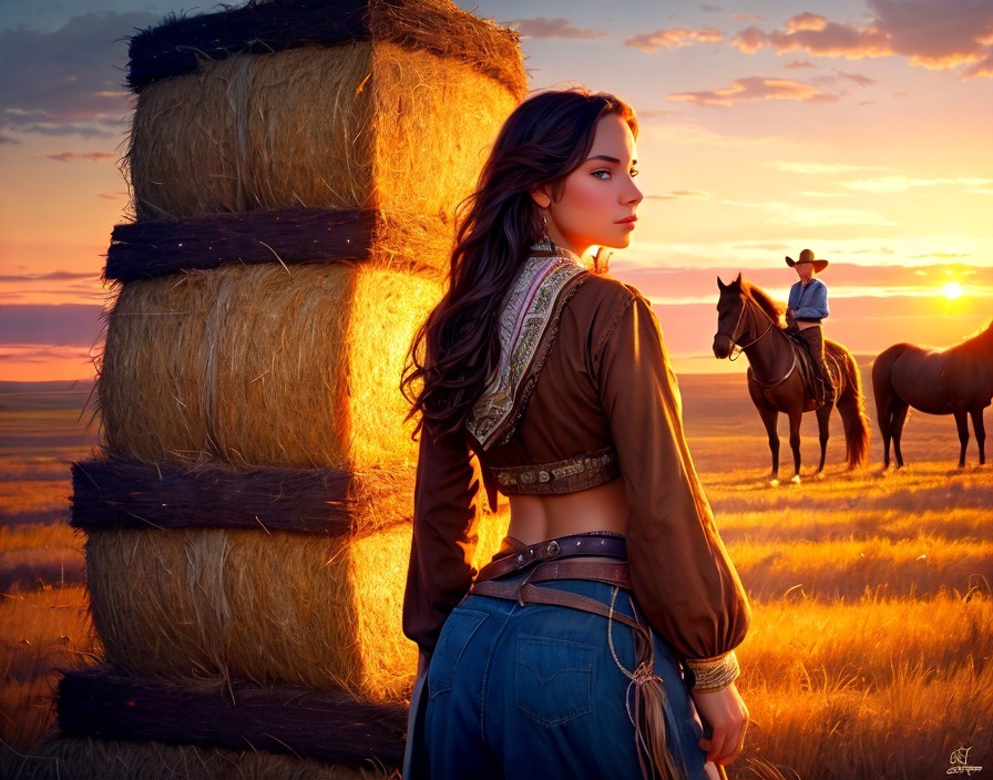 Woman in denim leaning against hay bales at sunset with person on horseback in field