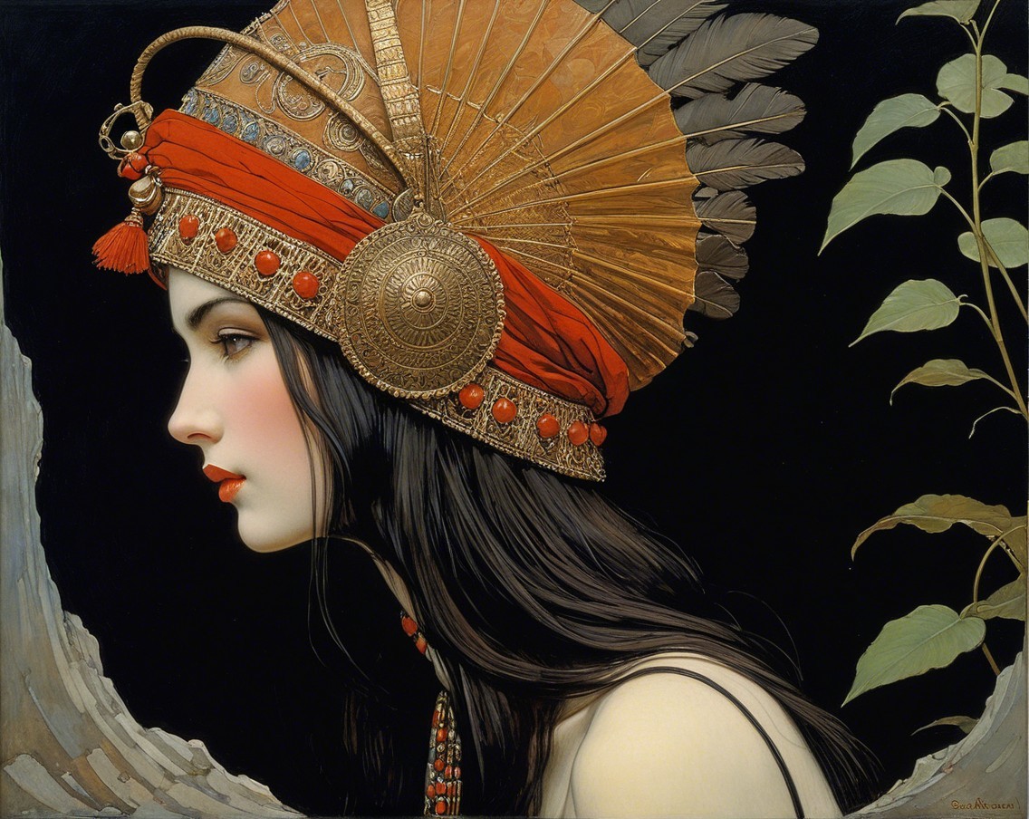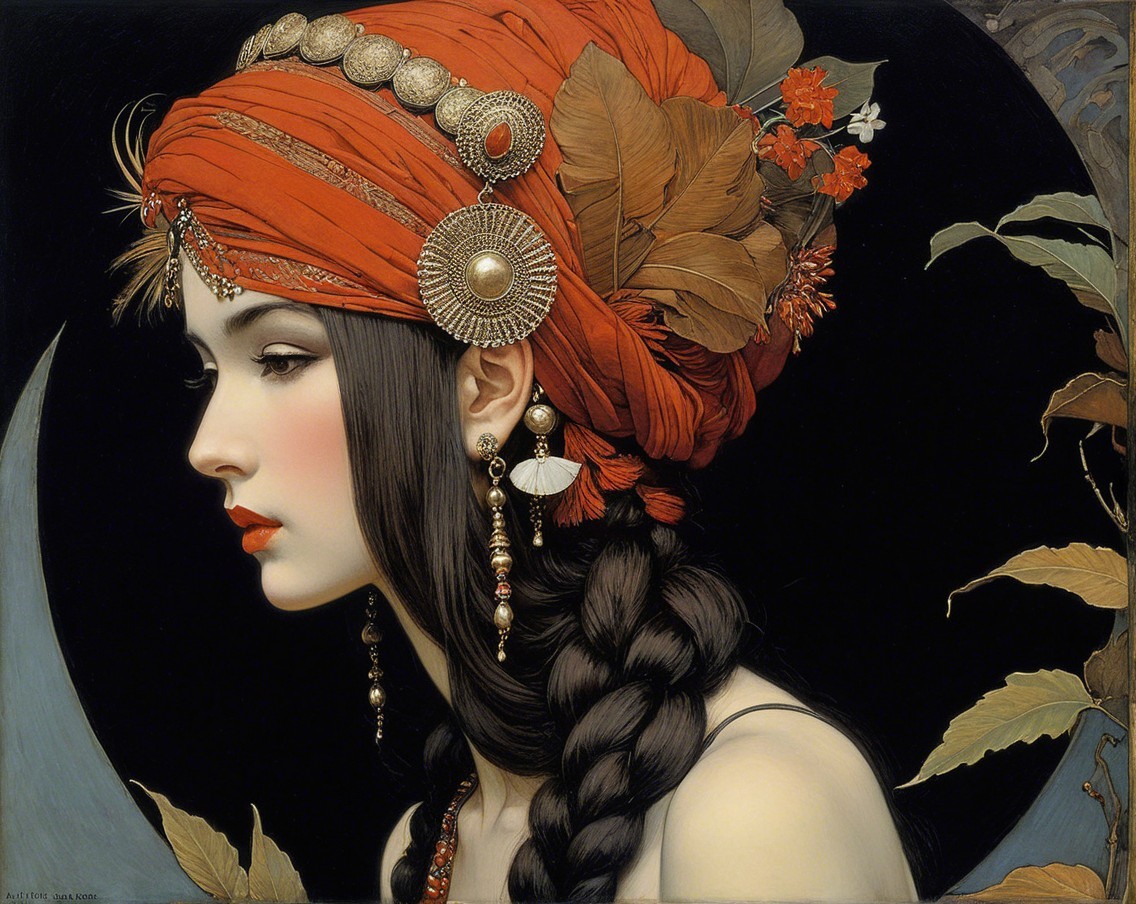 A striking woman with long, dark hair adorned in a vibrant red turban, accentuated by jewels. She gazes thoughtfully, alongside a small fox perched on a staff. The scene conveys mystery and elegance.