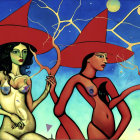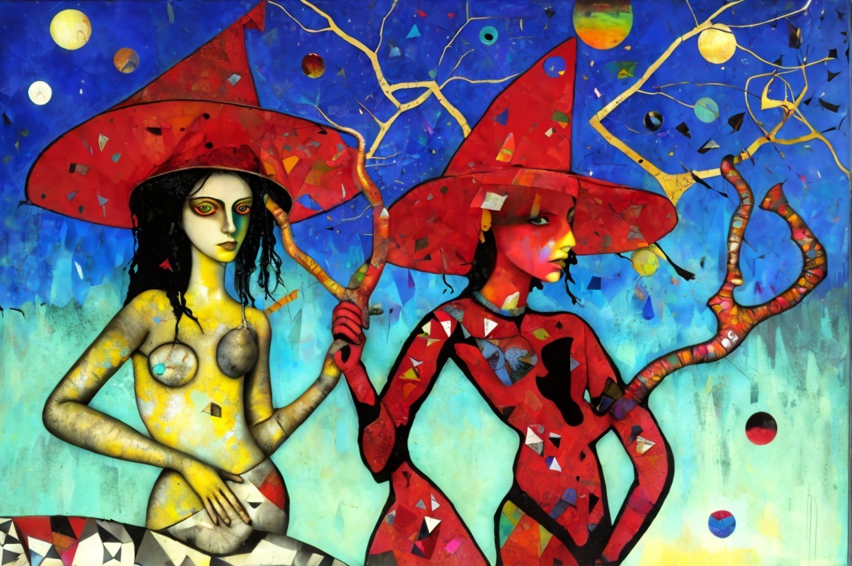 The artwork features two stylized women with vibrant red hats, set against a blue background. They exhibit contrasting colors and geometric shapes, surrounded by abstract trees and a whimsical landscape.