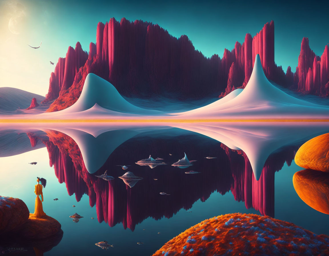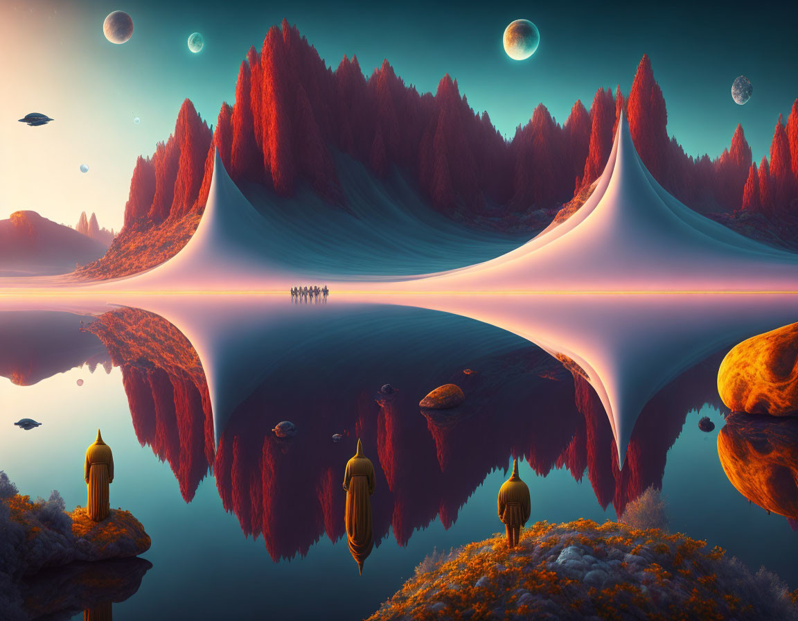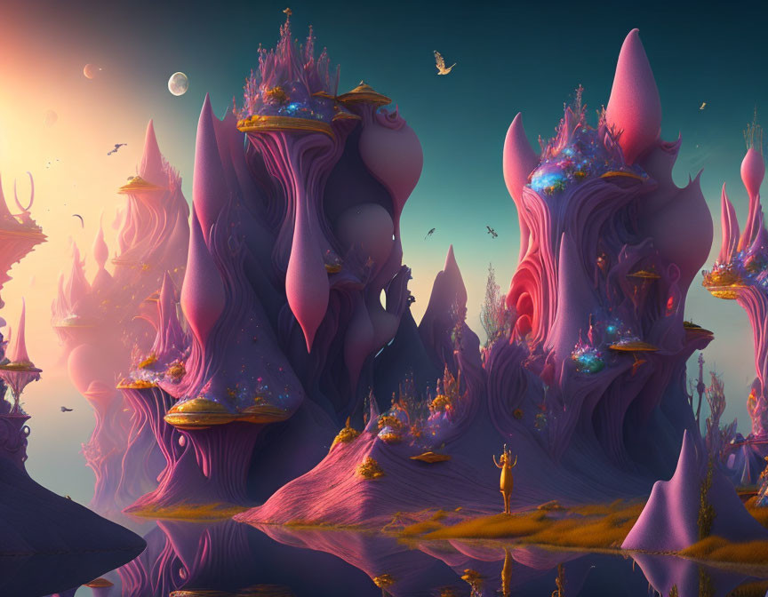 Vibrant pink and orange floating islands with unique structures