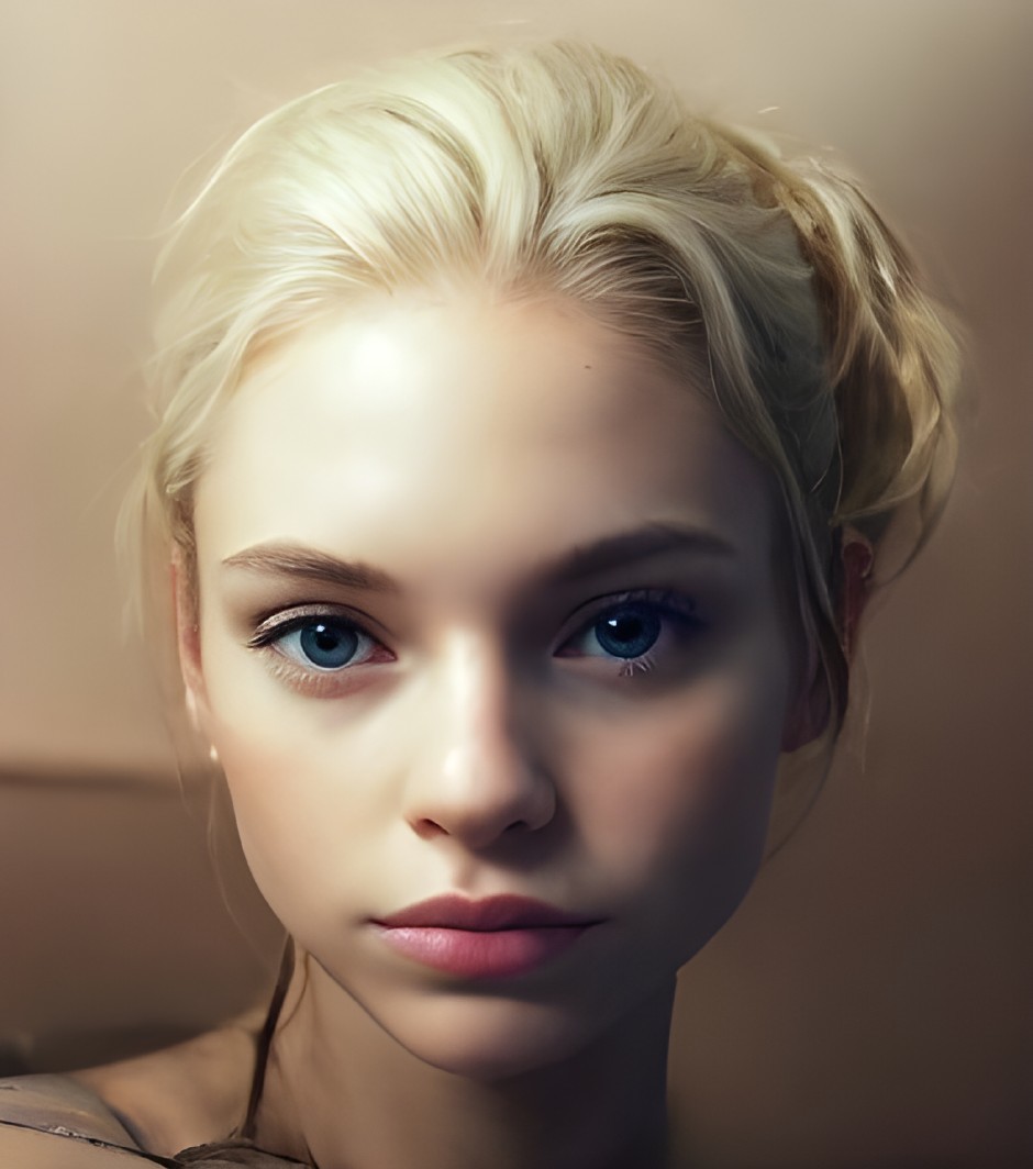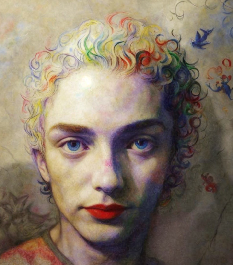 A person with rainbow-colored curly hair, bold red lips, and colorful fish illustrations in the background.