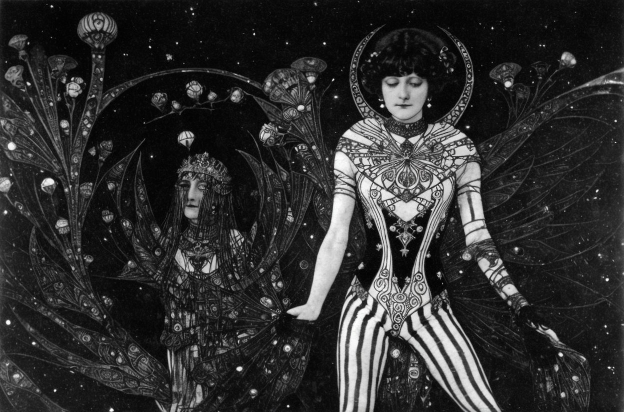 A striking black-and-white image featuring two elegantly adorned figures. One wears intricate patterns and a mask, while the other showcases elaborate wings and body art, evoking a mystical atmosphere.