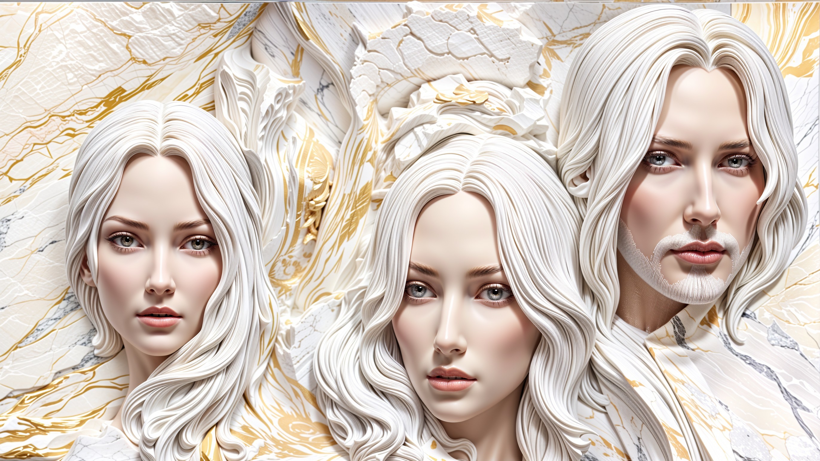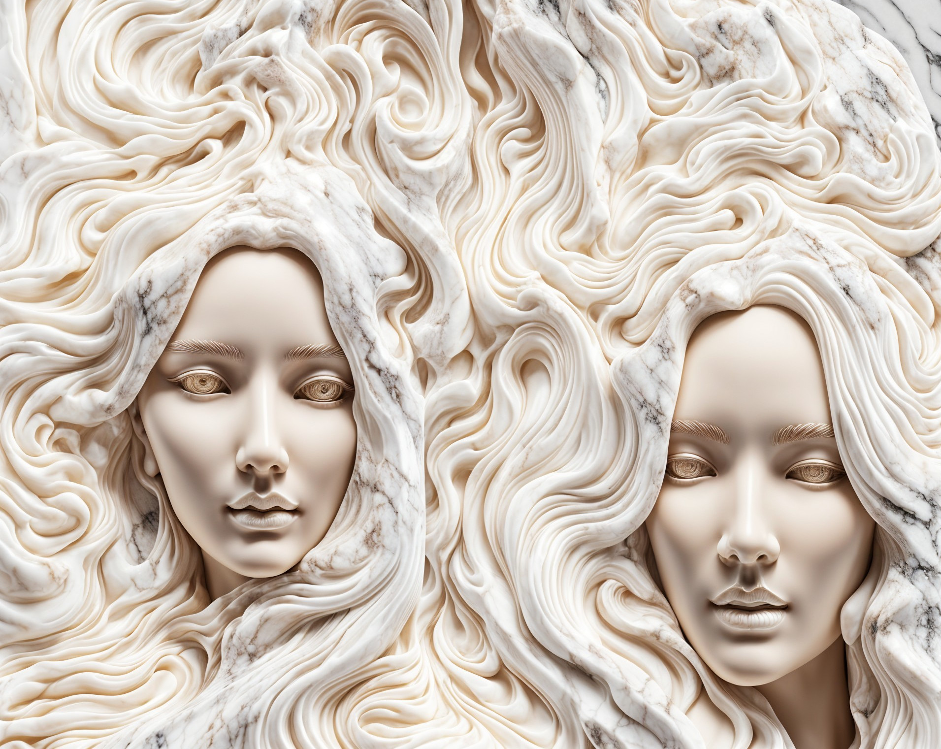 The image features intricately carved faces emerging from flowing, wave-like forms. The textures resemble marble and creamy sculpting material, creating a surreal and ethereal effect.