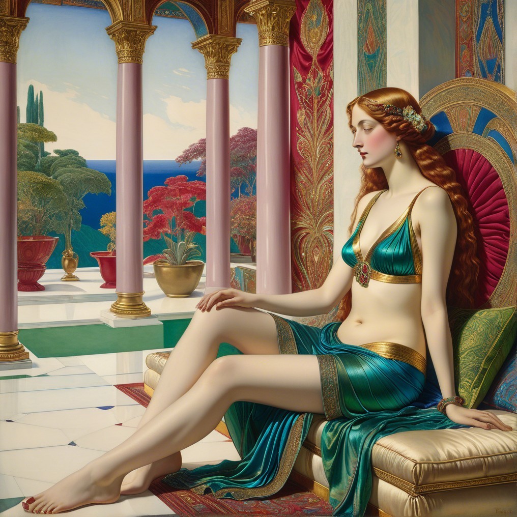 Prompt: Art deco with 3d detail and golden foil, double image, John Frederick Lewis painting a nymph priestess in flowing shawls in crimson, maroon, emerald blue room with pillows iridescent blue and green, dynamic poses, silk iridescent texture in watercolor and ink, vibrant colors with gold foil detail, by William Holman Hunt, Tomasz Sętowski, Enki Bilal, Vladimir Fedotko, Pietro Annigoni, Milo Manara, Botticelli, Catrin Welz-Stein, Jean Metzinger, Klimt, perfect eyes, perfect face,